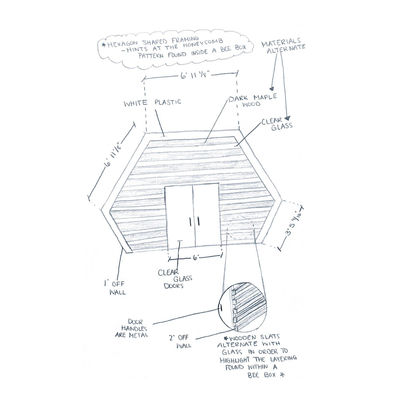 The shop was designed with the concept of bee boxes. Bee boxes are made primarily of wood, and they are comprised of various layers and compartments. They also have a small “hidden” element enclosed within them, the honey comb. The utilization of layering and compartments are incorporated into the overall design of the space, as well as subtle/ “hidden” honey comb elements that can bee seen throughout. The materials and colors that can be found in many bee boxes are used as the primary materials for both the shop and the custom fixtures.